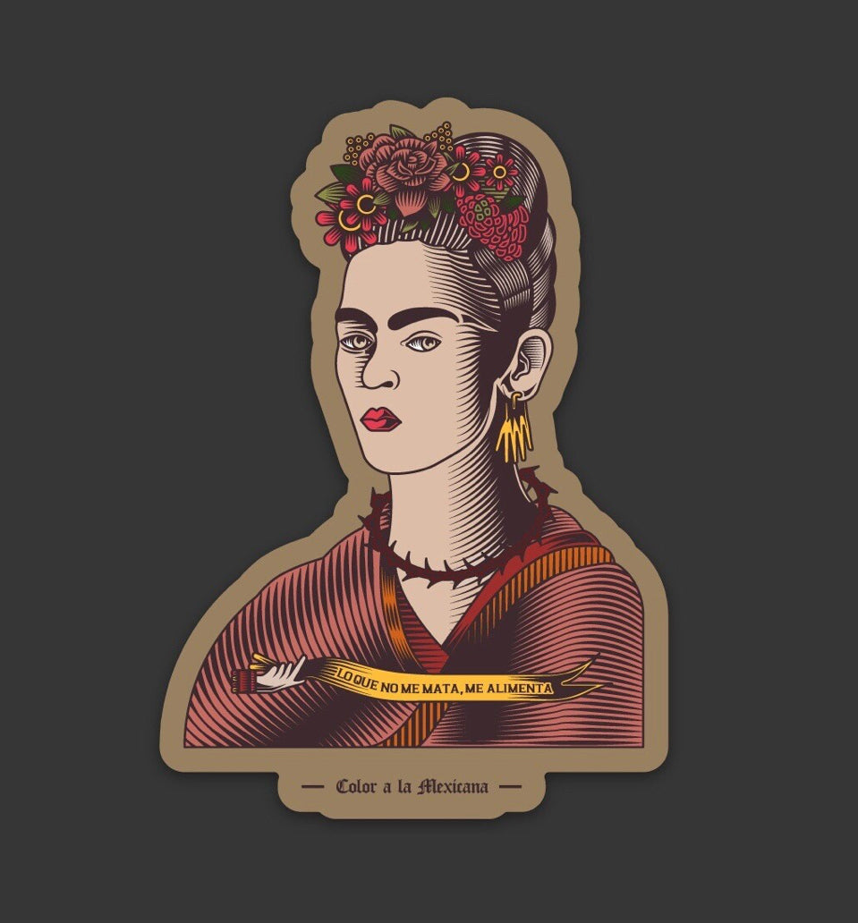 Color Ala Mexican Frida sticker “Lo que no me mata, me alimenta” translates to “what doesn’t kill me feeds me”.